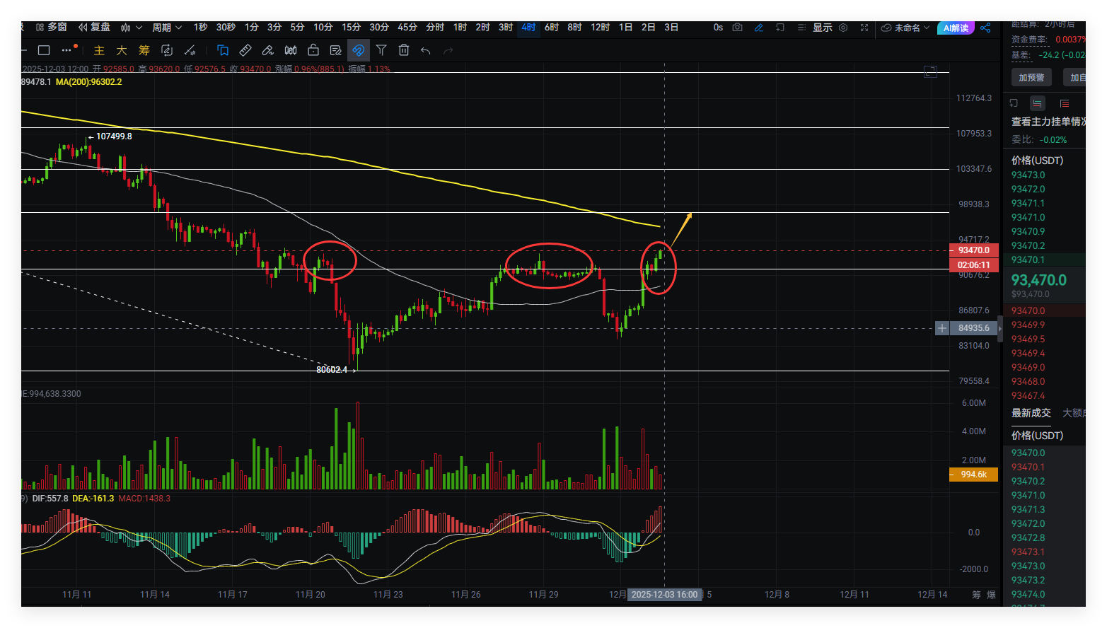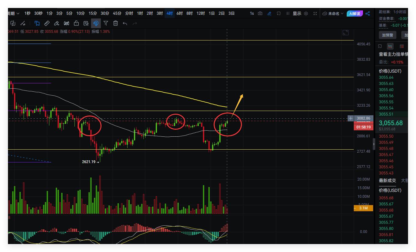 昨日文中提及白盘将有反弹,行情也如预期走出,截止目前比特币反弹高点93625位置,还在持续拉高,以太坊高点3069,也还在持续拉高,目前多头强势,后市将会有更高拉升;