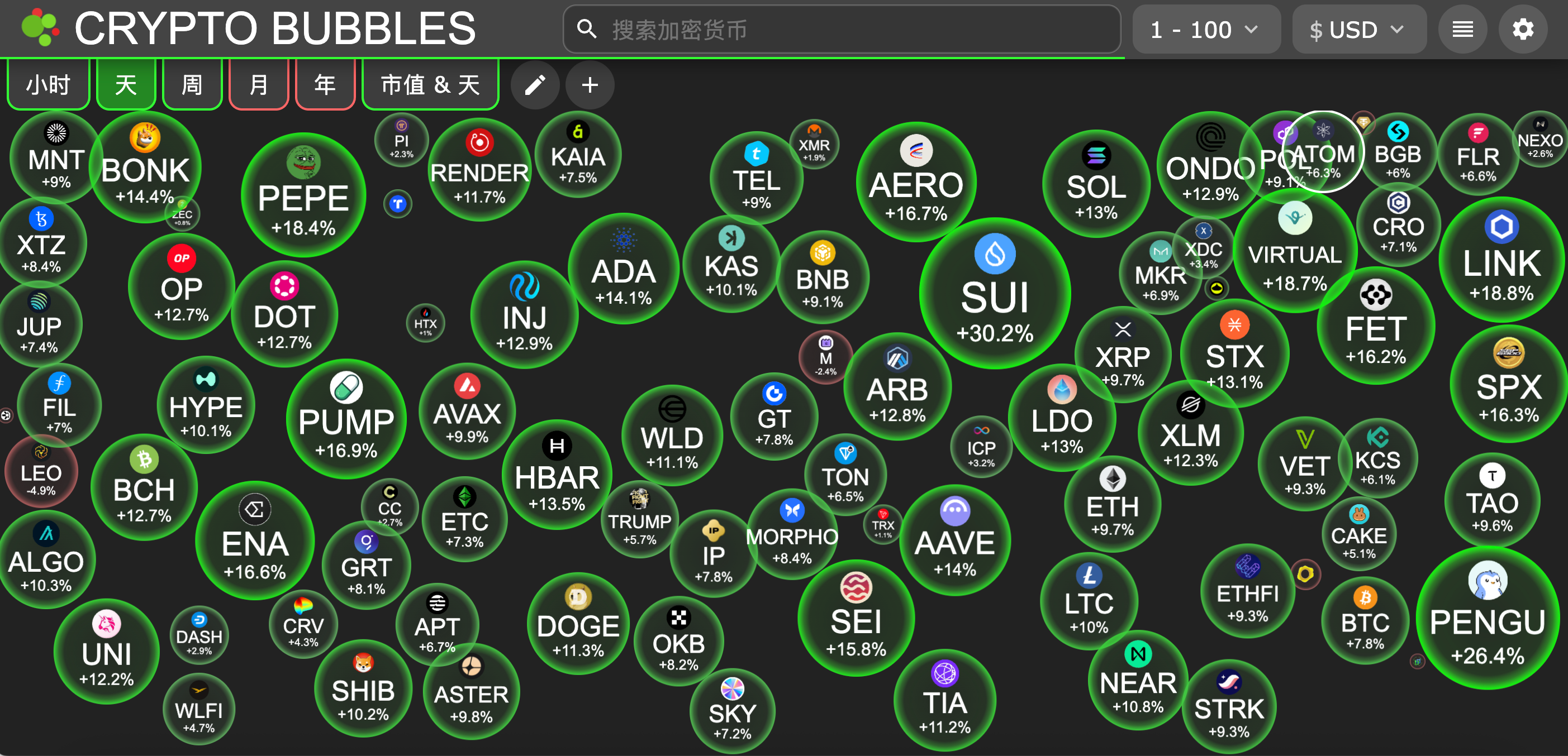 今日市值前100币种最大涨幅:Sui涨30.2%、Pudgy Penguins涨26.4%、Chainlink涨18.9%、Virtuals Protocol涨18.7%、Pepe涨18.5%