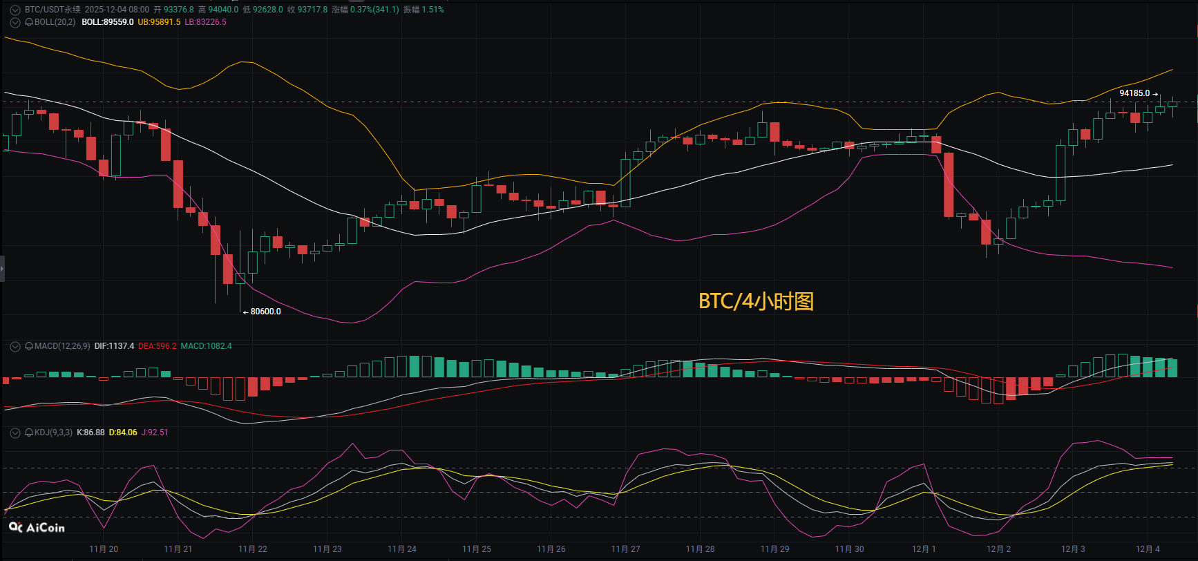 比特币昨日延续上行,如预期企稳在9万上方区域,目前高位触及94180附近位置承压,行情回调进入高位盘整,短线日线级别上呈上行趋势,且价格企稳日线中轨,日内只要回调没有跌破9万一线位置,预计涨幅还将延续短周期4小时图来看,最近几根K线呈现高位震荡格局,价格在93000至94000区间内反复波动。当前收盘价93904.99接近昨日高点93912.21,上方存在一定抛压,暂时未能形成有效突破。