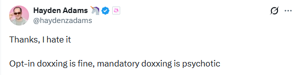 这一要求也与此前Uniswap创始人Hayden Adams抵制强制实名的观点相违背。