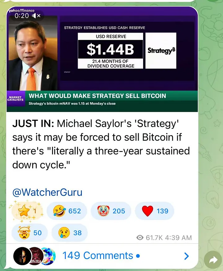 乍看之下,这似乎是一则令人不安的消息 — — 那个号称「只买不卖」、拥有钻石手的比特币最大企业持有者,竟然松口提到了「卖出」二字。然而,当我们剥开情绪的洋葱,深入审视截图中的财务数据(14.4亿美元现金储备)和其设定的极端前提条件时,会发现这并非是一份「投降书」,而是一份精心设计的「压力测试报告」。