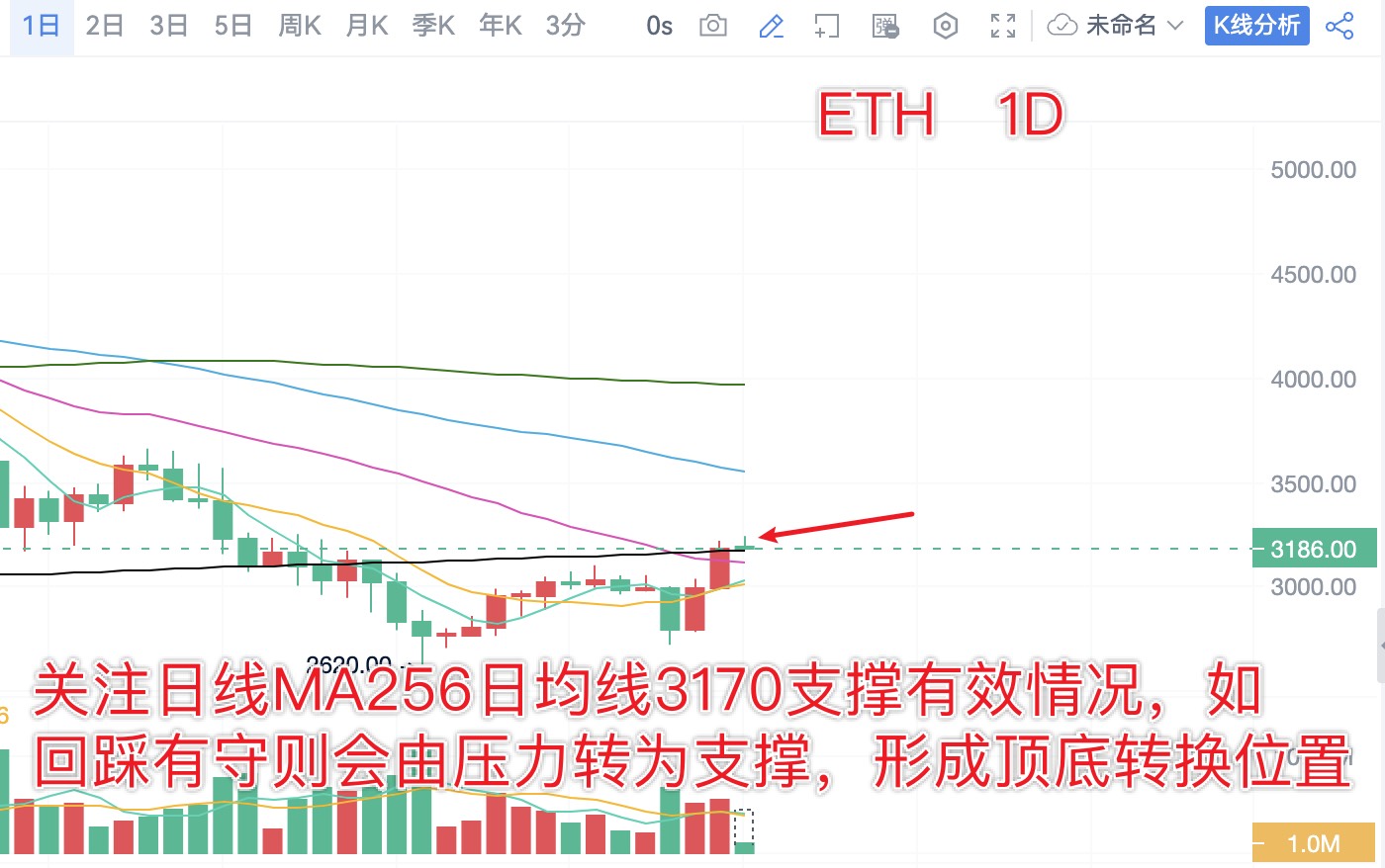 以太坊从日线图上看,日线连续收2根大阳线价格反弹至日线MA256日均线处,目前价格保持在此一线3170震荡,关注后续回踩3170是否有守,如有守则短线确立3170支撑有效由压力转变为支撑位,将开启新一轮上涨行情,压力位关注4小时MA256日均线3360一线。