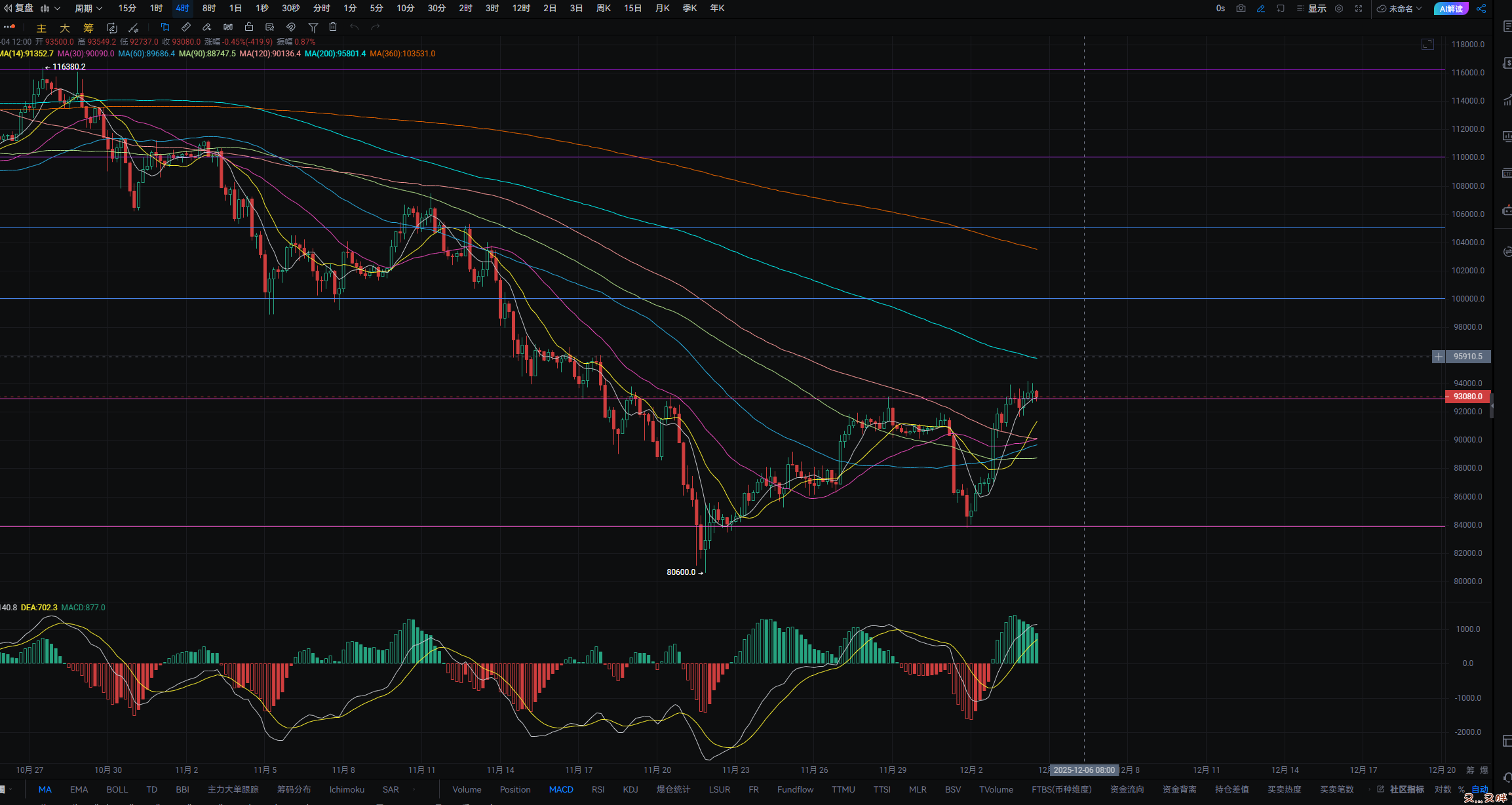 从上上周五威廉姆斯的讲话开始,投资者的情绪就开始回暖,这再次证明了美联储的货币管理是当前市场的主要叙事。接下来只要12月降息预期不被打破、点阵图不出现明显鹰化,市场就会自然维持在偏乐观的区间里。其实这也说明了在宏观不出系统性么蛾子的前提下,投资者关注的核心已经不再是分项数据本身,而是美联储是否愿意通过引发经济下行的方式来阻碍通胀的上涨。威廉姆斯的讲话之所以能立刻稳定市场,不是因为内容多么鸽派,而是发出了一个非常明确的信号,美联储已经意识到金融环境的收紧力度超出了预期,需要通过沟通来避免非必要的市场去杠杆。而在当前这个增长放缓但未衰退、通涨下行但未到底的窗口期,政策态度的变化会被市场放大为趋势性的方向指引。大饼反弹至94300-95500附近可进行接空 然后实体跌破91700可看至90700附近