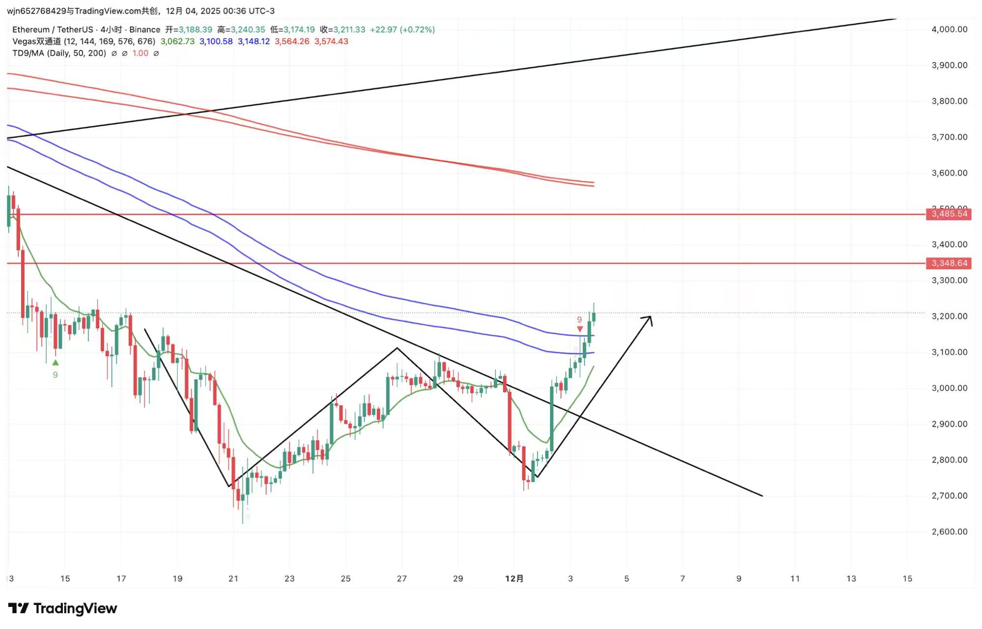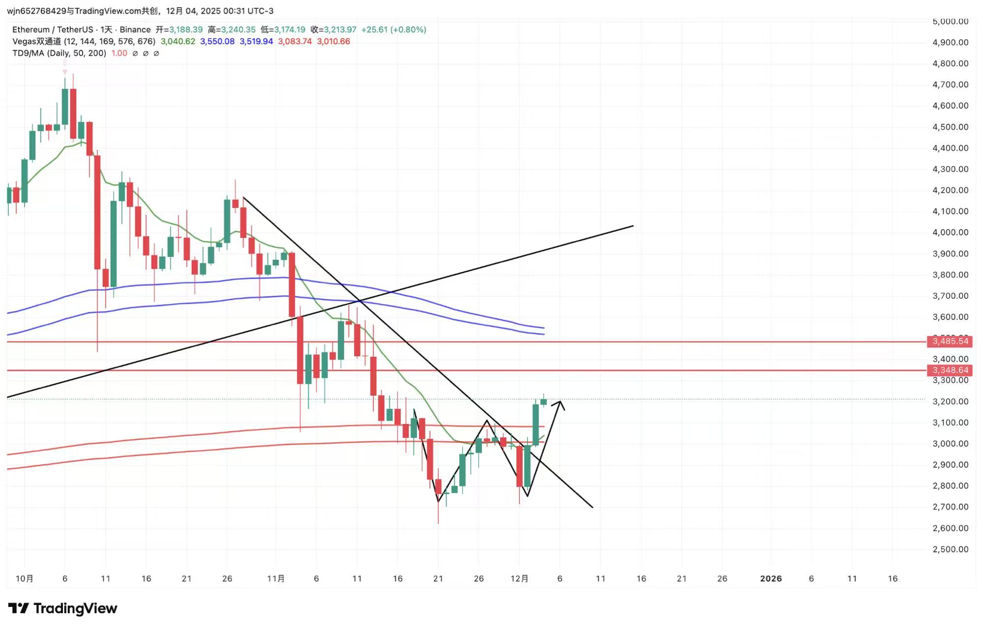 以太周线级别:价格当前处于跌破趋势线后的反抽,处于下跌反弹阶段,所以当前价格在反弹-回测-确认阻力,从反弹力度看已到3200+,但上方仍然有多重阻力:3340,3480,3600,这些前高水平阻力区域都可能成为本轮反弹的终点。只要不破3600,大趋势仍然看下跌