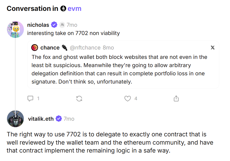 毕竟从 EOA 迁移到 AA 需要用户把资产转移到新地址,这太麻烦了,这就引申出 Vitalik Buterin 此前提出的 EIP-7702 提案,它巧妙地解决了此前三个提案(EIP-4337、EIP-3074、EIP-5003)争论不休的兼容性难题,做了一件神奇的事:允许现有的 EOA 账户在交易期间,「临时变身」为智能合约账户。