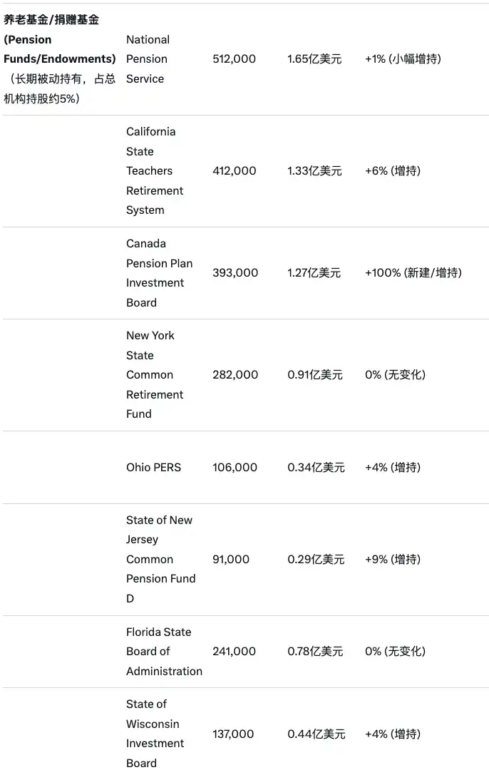 除去银行机构,养老基金及捐赠基金也是 Strategy 股票持仓选手的「主力军」之一,而且,得益于其规模巨大的资金量,或许 Strategy 股票增持的后续希望仍然需要看他们的表现。