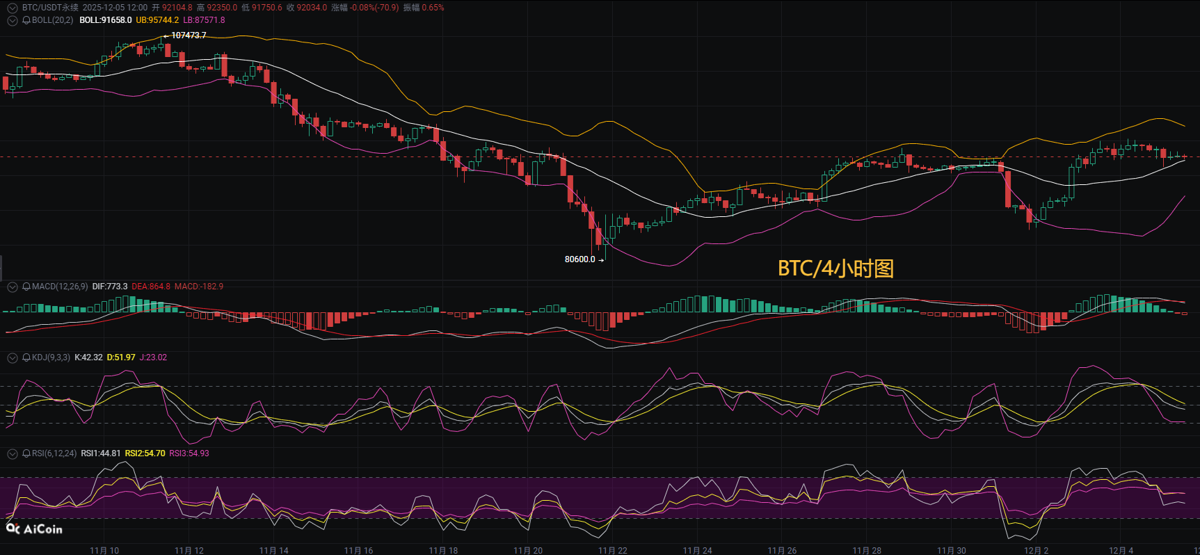 短周期小时图上看,布林带呈收口试探,昨日多次试探承压,后续多头力度减弱。目前价格在92000附近位置运行,走势处于回调整理,短线触及中轨走出反弹,下方支撑没有跌破,短期多空双方开始胶着,且各均线及附图指标相继走平,预计盘整行情还将延续一段时间,望各位币友提起做好准备。上方压制关注95000位置附近,下方支撑关注9万关口位置,