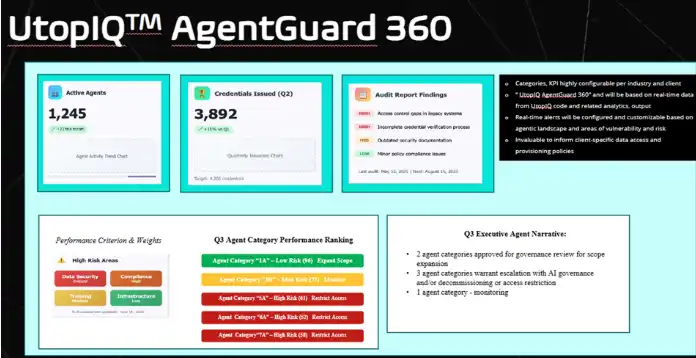 UtopIQ 是这一转变的早期信号之一。他们的平台推出了所谓的 AI 代理控制面板,通过动态凭证和区块链支持的审计日志,确保代理仅在授权范围内运行。用他们的话来说,AI 必须在「知情即所需」的原则下运作,每个代理行为都应「透明、授权、可审计」。
