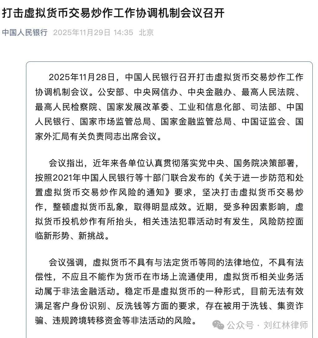 在此背景下,再看此次会议所说的三件事:虚拟货币不具有法偿性、不得作为货币使用;虚拟货币相关业务属于非法金融活动;稳定币是虚拟货币的一种,不满足 KYC、AML、跨境监管要求。这些内容从字面上确实没有新鲜感,但关键不在内容,而在会议的时间节点。