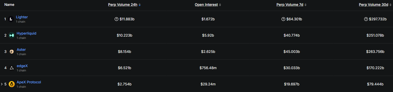 据DefiLlama数据,Lighter当前在日交易量与周交易量均位居去中心化永续合约 DEX 之首。其日交易量约达 119 亿美元,周交易量超过 643 亿美元。过去 30 天内,Lighter以约 2,977 亿美元的永续合约交易量,领先于Hyperliquid 的 2,511 亿美元,稳居赛道第一。