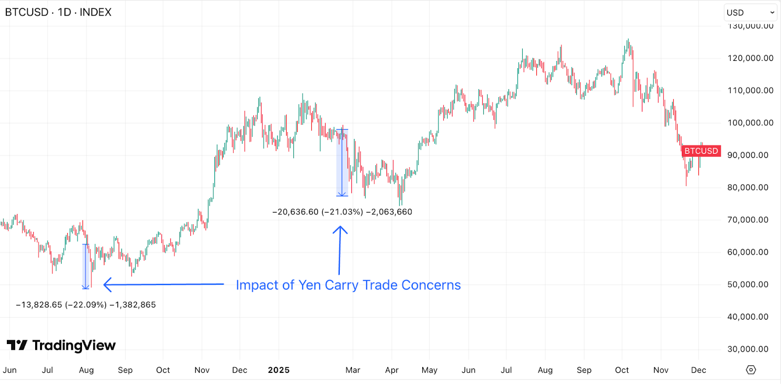 Otychenko 认为这可能会对“日元套利交易”施加压力——即交易者在日本市场利率较低时借入廉价资金进行交易。Otychenko 指出,在2024年8月和2025年2月,比特币在类似的日元套利交易环境担忧中经历了短暂的20%价格下跌和ETF流出增加的情况 在类似的担忧中