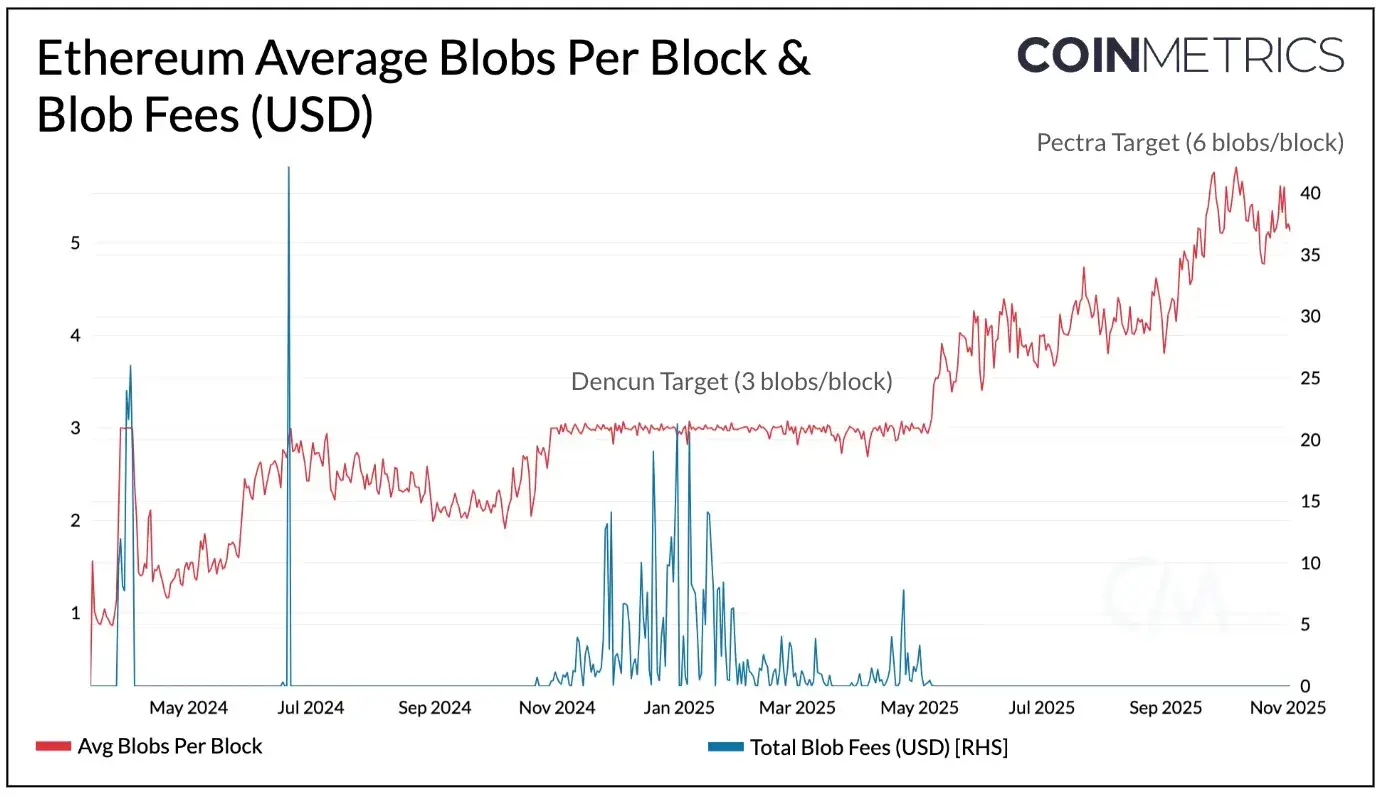 去年的Decun升级引入了高效的“Blob”,这是一种在以太坊主网上存储交易数据的Rollup的经济方式。从那时起,Blobs在Base、Arbitrum和Lighter等Rollup的推动下得到了很多。这导致Blob量使用接近高峰(目前接近每6个Blob块的目标),存在Rollup,从而呈指数级激增的风险。更高的数据可用性(DA)需求使得Blob空间成为以太坊扩容路径中的关键瓶颈,而Fusaka直接解决了这些限制。