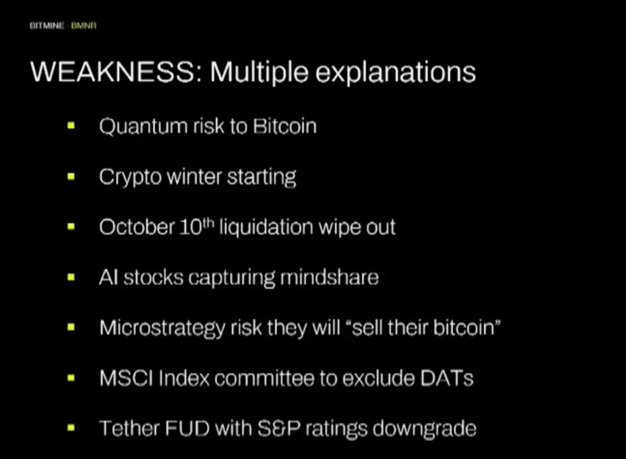 他进一步指出,比特币的转折点发生在10月10日。在此之前,比特币年内上涨了36%,之后便一路下跌。市场上有很多解释:量子计算风险、四年周期论、10月10日的历史性清算事件、AI股票分流了注意力、Strategy可能出售比特币的传言、MSCI可能将数字资产金库公司排除出指数,以及Tether的评级被下调等。