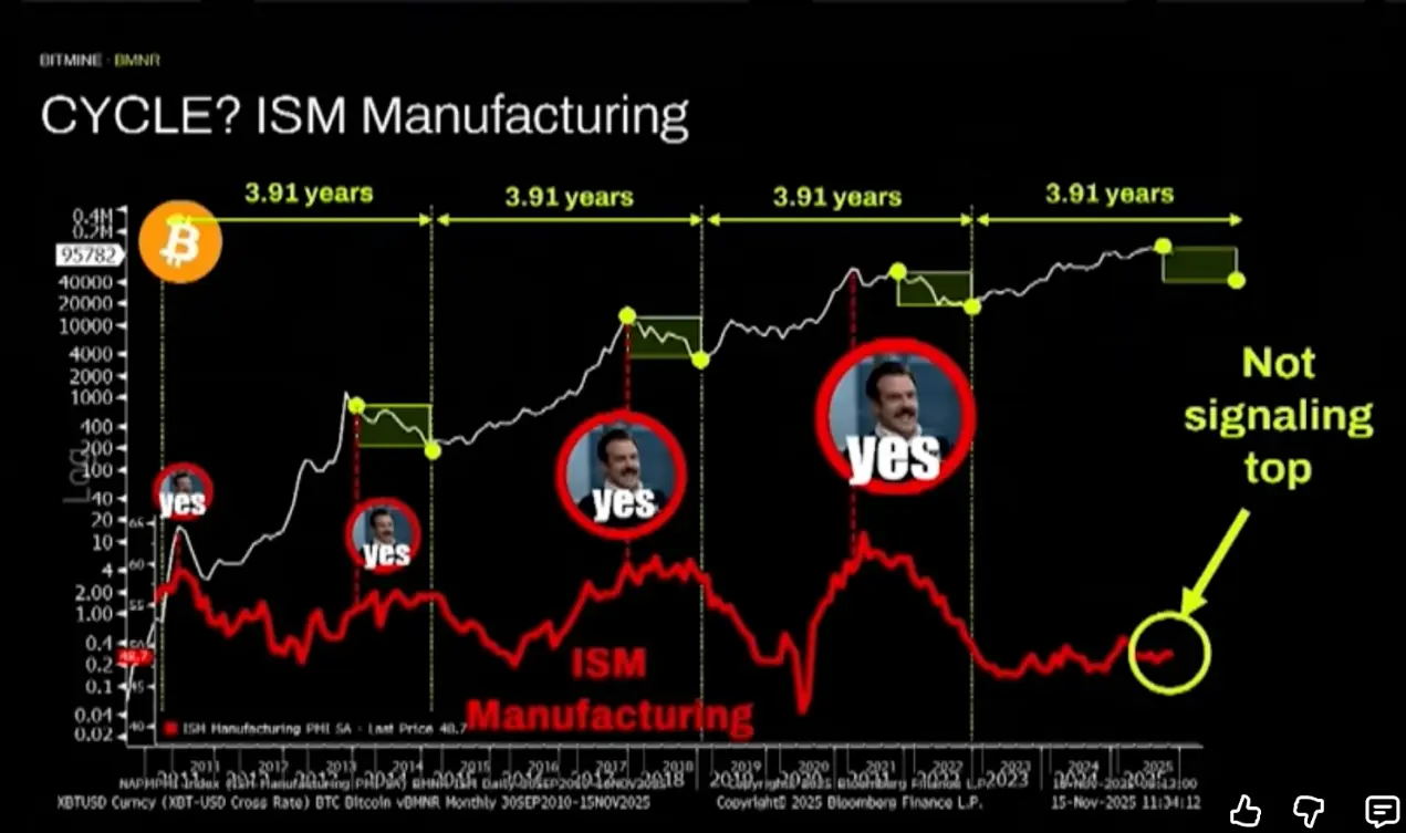 另外,Tom Lee还谈到了困扰所有人的“比特币四年周期”他指出,历史上,它三次都精准预测了顶部和底部,主流解释通常与减半周期、货币政策等相关。但Fundstrat团队发现,铜金比“ISM制造业指数(即传统经济周期)这两个指标,与比特币周期的关联性甚至更强。