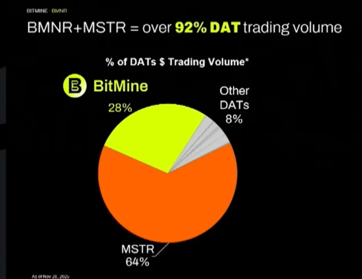 目前,Strategy和BitMIne占据了所有加密财库公司总交易量的92%。其中Strategy的策略是成为“数字信贷工具”,而BitMine的策略,是连接华尔街、以太坊和DeFi。