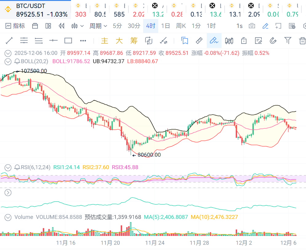 BTC:4小时级别看,价格回调到布林线下轨附近,价格走势弱势,短线行情超卖,有弱反弹需求。