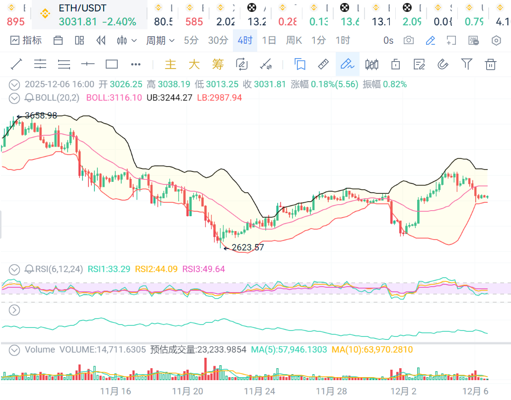 ETH:4小时级别看,价格继续保持在布林线中轨之下,价格走势弱势,支撑位3020,压力位3040.