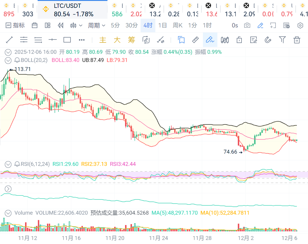 LTC:价格继续保持在布林线下轨附近,价格走势弱势,支撑位79,压力位82.