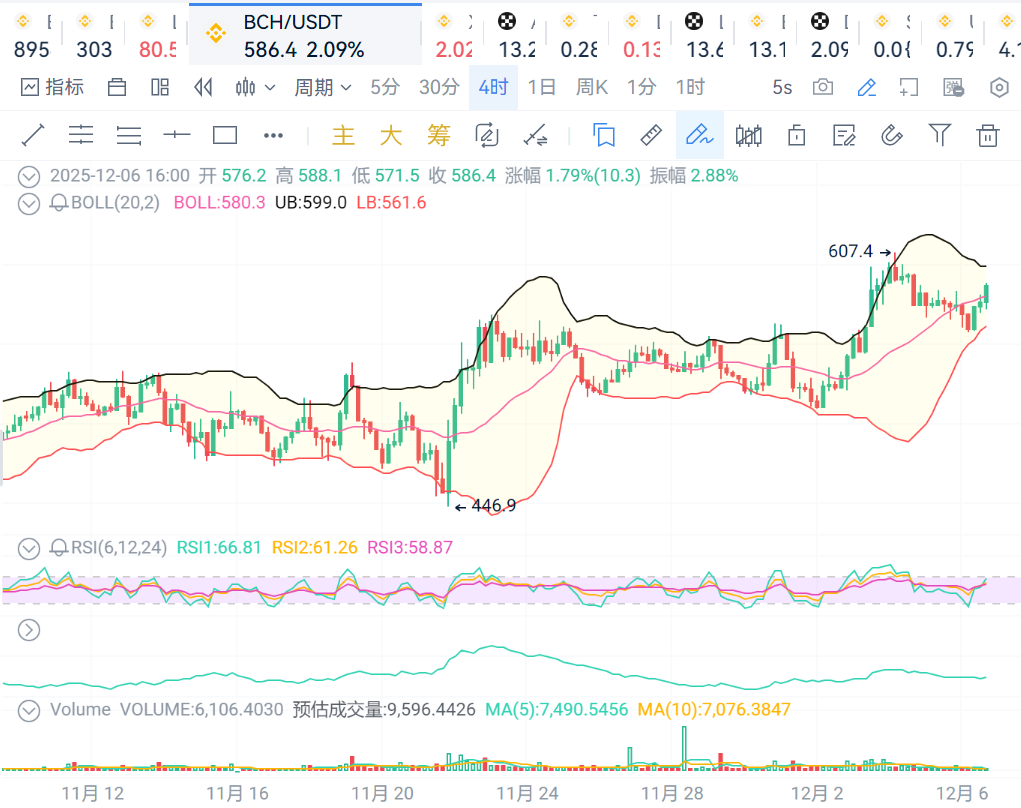 BCH:价格站上布林线中轨,价格走势依旧健康,支撑位570,压力位600.