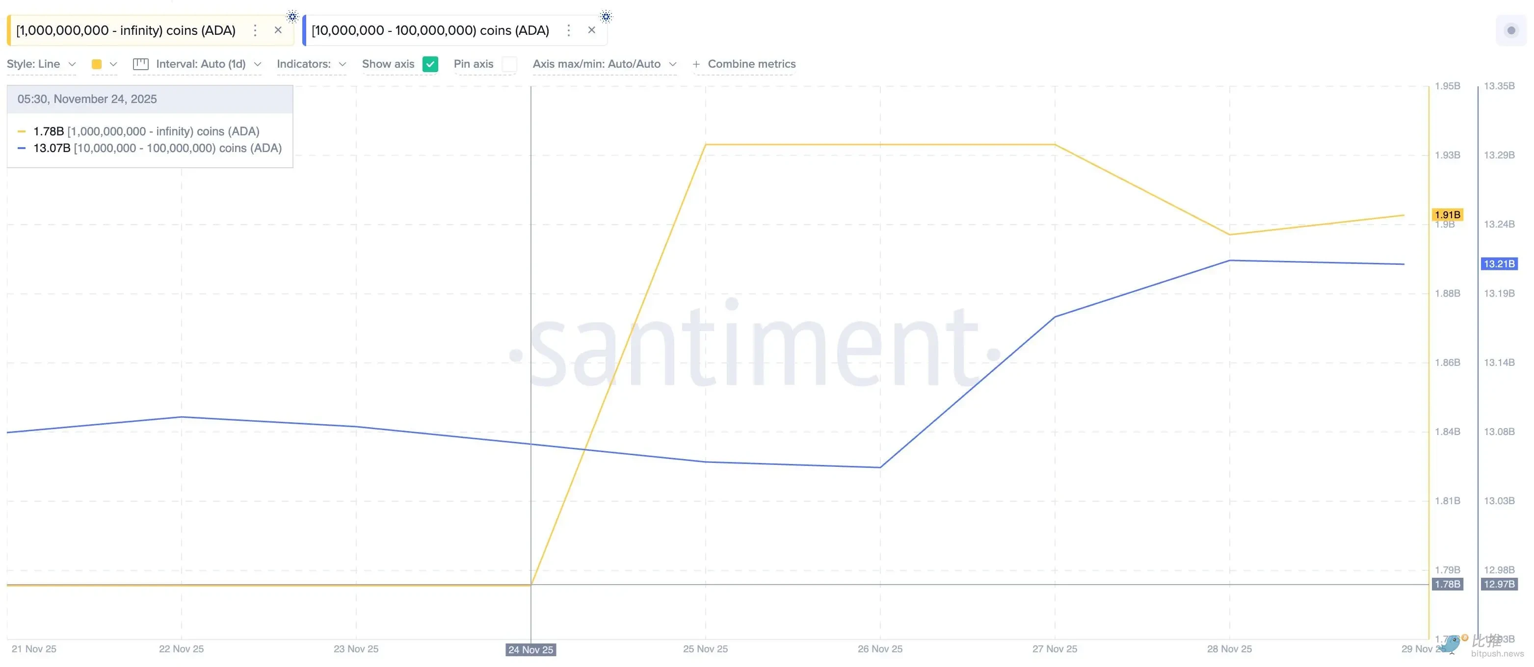 • 持有量在 1000 万至 1 亿枚之间的钱包则于 11 月 26 日开始增持,增持量为 1.5 亿枚 ADA;