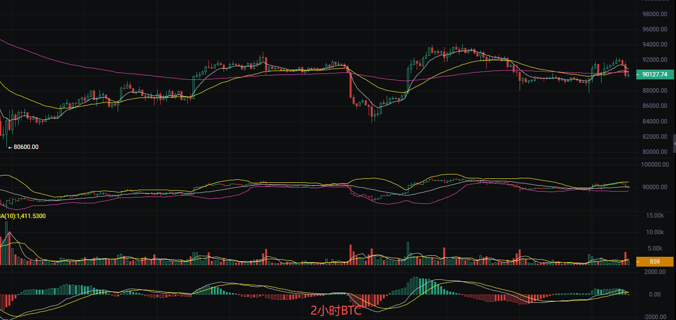 比特币现价90150,丽盈判断大饼BTC震荡技术面和外部环境均未提供明确的趋势性指引。短期动能活跃且形成看涨吞没形态与短期均线向上斜率的共振,表明短期内存在反弹可能。日线在90000附近震荡整体仍处于高位调整阶段。2小时从91467回落至90008一,形成短期下降趋势,高点逐步降低。MACD2小时短期空头占优;日线动能减弱。EMA短期均线压制明显。由此可见主力想要开启多头还是需要时间积累筹码,至少短期内筹码不足,破前高很难,思路上丽盈偏向于盘整,做波段为主
