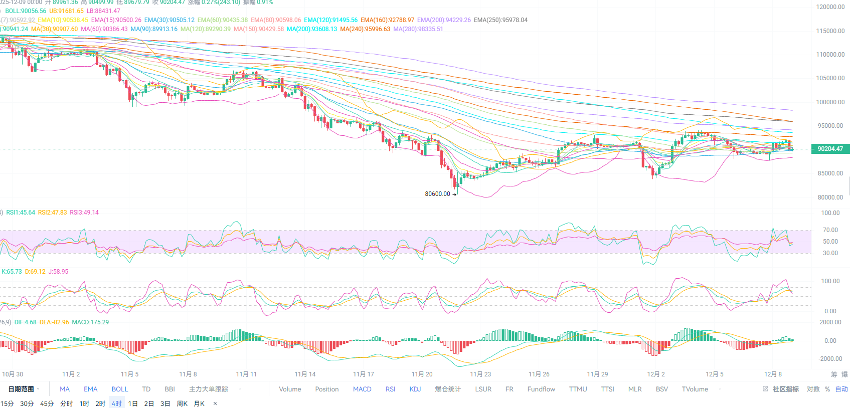 比特币现价90150附近。日内行情冲击4H上轨继续承压回落,BOLL上轨下压接近EMA120,日内可能将继续受阻于此,目前k线位于中轨位置,MACD中绿柱缩量明显,DIF与DEA收口有望形成死叉,RSI三线拐头向上,短线多头可能还要冲一波,KDJ三线交叉向下,后续下方空间存在,红姐建议高空可以减仓止盈,继续持有看破位MA120走到下轨位置!短线反弹可保持高空入场为主,下方重点关注日线中轨下方支撑可短多接入!