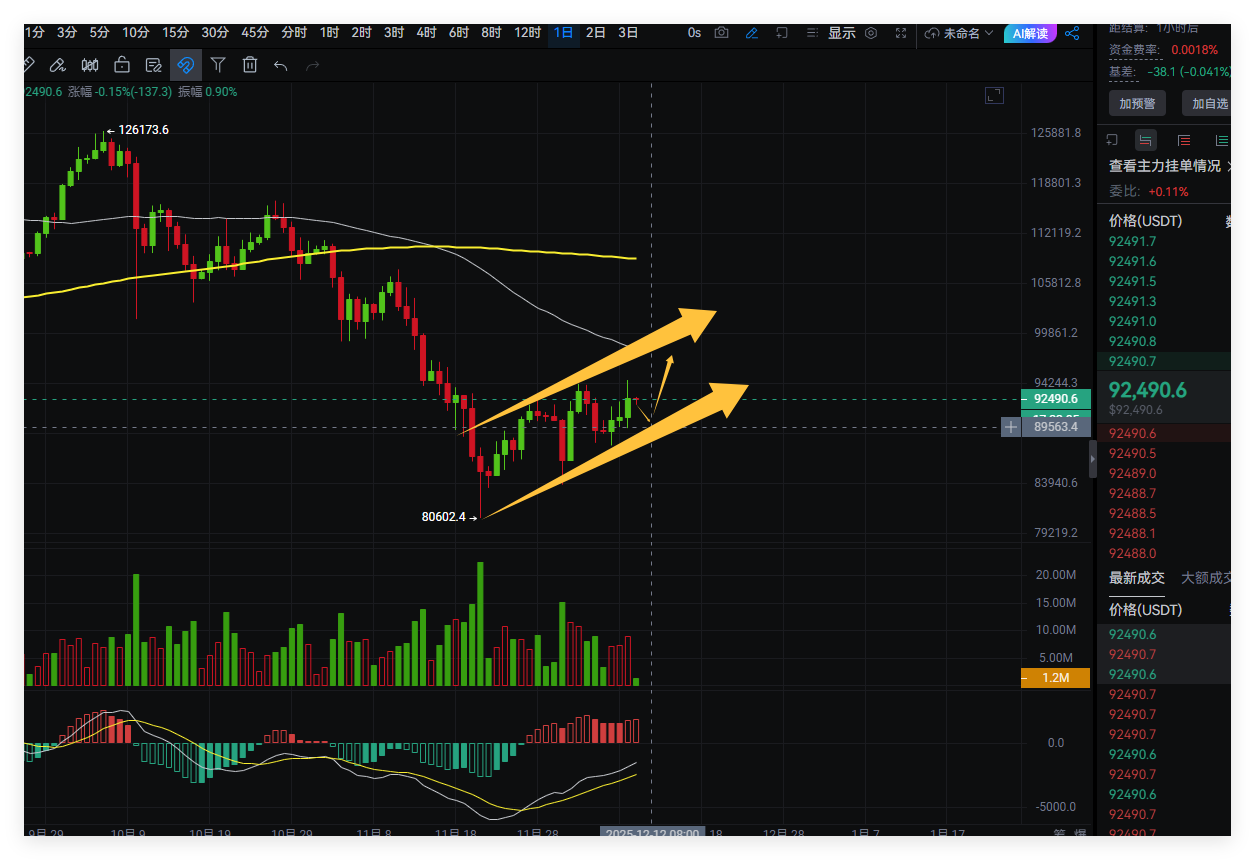 日线上看,比特币整体并未打破多头趋势,依旧在上升通道中运行,低点和高点都在不断抬高,短线94000给到一定压力,突破还需时间,长线多单可继续持有,目前大饼再度试探94000压力并未站稳,短线需有一定的回调才会拉升,回调区间预计在91400-90500,短线可围绕这一区间去做多布局,目标先看94000,突破可继续持有,多头趋势中,任何回调就是布局机会,自行把握进场;短线交易,控制风险,盈亏自理;