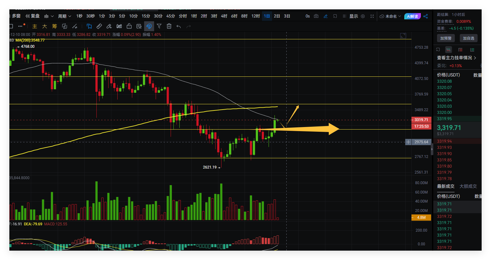 日线上看,以太坊的拉升力度是强于大饼的,以太突破前面压力3170位置大阳线,这种走势就属于有效突破,前面的一次并未站稳,后市行情也走出回调,整体来看以太坊也是属于多头强势阶段,交易上长线多单继续拿,短线可等待回调后做多布局,推荐点位3170附近,止损3070,目标3510附近,自行把握进场机会;短线交易,控制风险,盈亏自理;