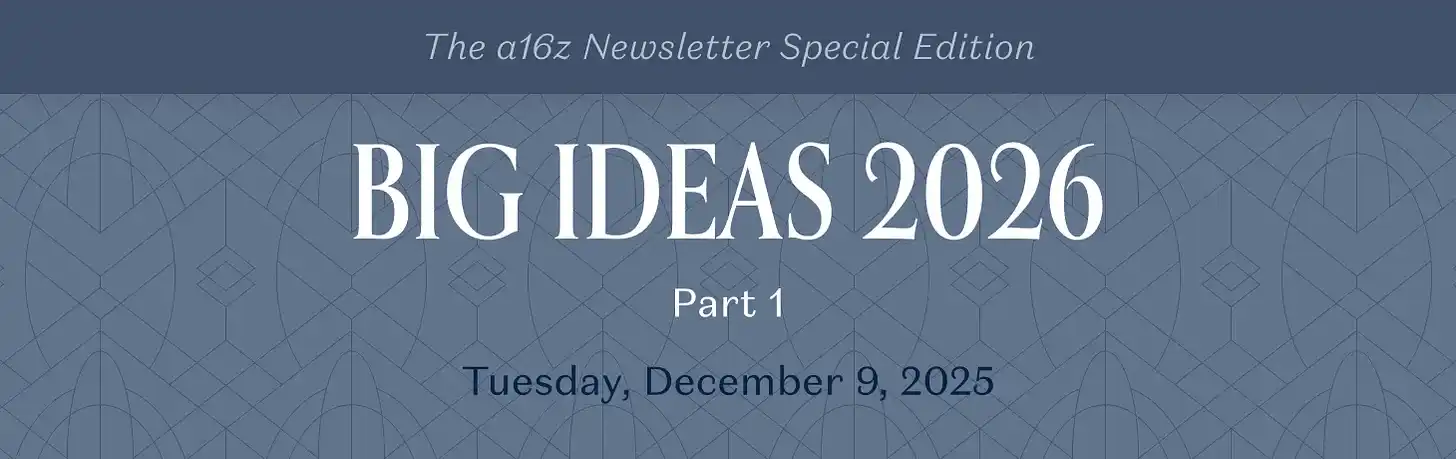 在年度《Big Ideas》中,a16z 的四个投资团队分别从基础设施、增长、医疗健康与互动世界四个维度给出了 2026 年的关键洞察。