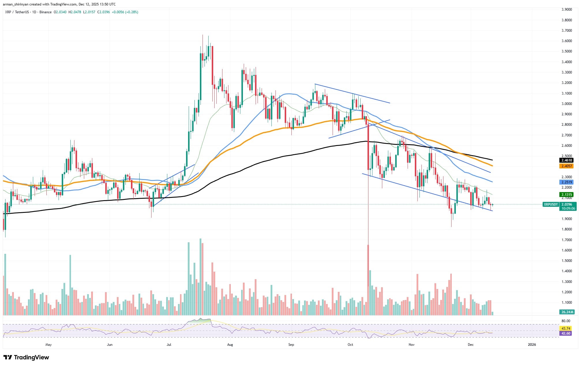 在过去几周中,XRP一直在进行系统性的、耗时的积累,而不是恐慌性抛售。自十月的下跌以来,XRP一直被困在日线图的下降通道中。当前价格在$2.00-$2.05区间,接近通道的下边界。这个区域已经经历了多次测试,并且至关重要的是,仍然保持完整。