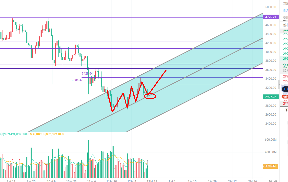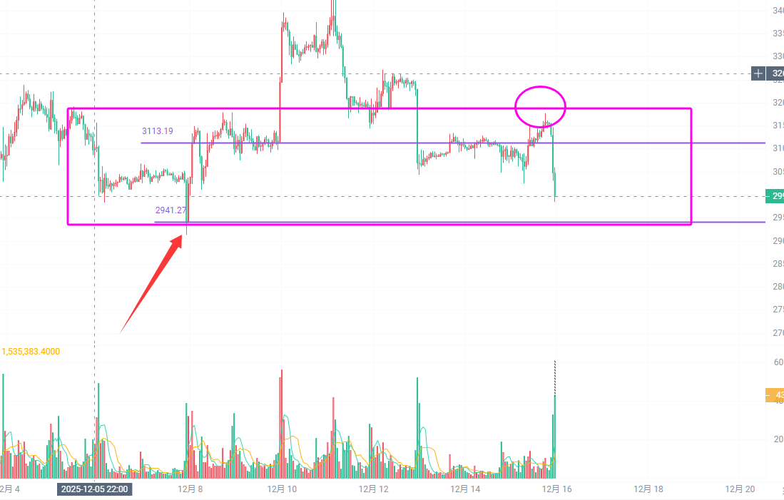 ETH:二饼现在是反弹有多猛,下跌就有多快,今天夜盘我们就只需要关注2950-2930这个分水岭能否守住,守住了就是出现白盘的V返,没有守住就是还会继续下探2800的强支撑颈线平台,