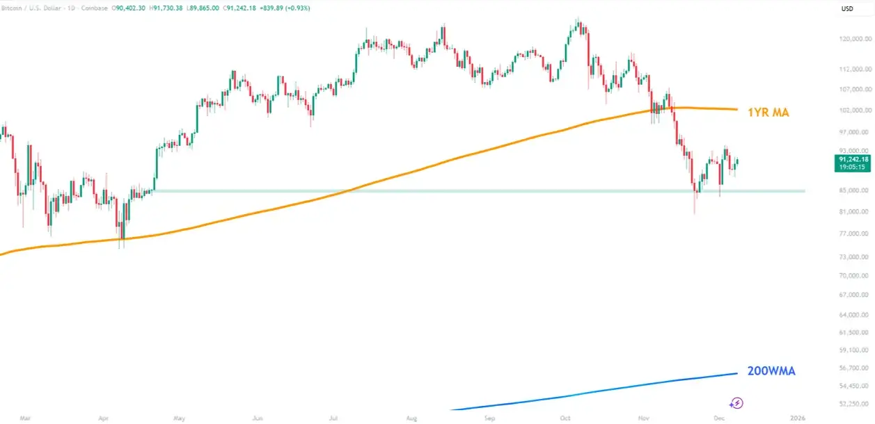 从技术面上看,虽然我们几周前强调的支撑位(下方图形中的绿色区域)仍发挥作用,但目前的反弹力度略显疲软。如果价格再次回踩85、000美元的支撑位,将不会是一个看涨信号。