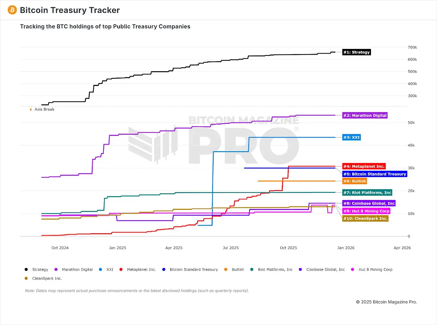 目前,微依然策略是持有比特币数量最多的上市公司,且一直在持续增持。这种优势在“国库追踪图表”中清晰可见: