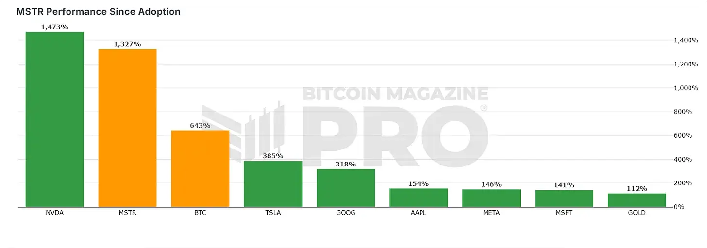 由于微价股价策略近期回调,自采用“比特币标准”以来,英伟达(Nvidia)的股价表现已超越了微策略。然而,微依然策略保持着1,327% 的惊人增幅。