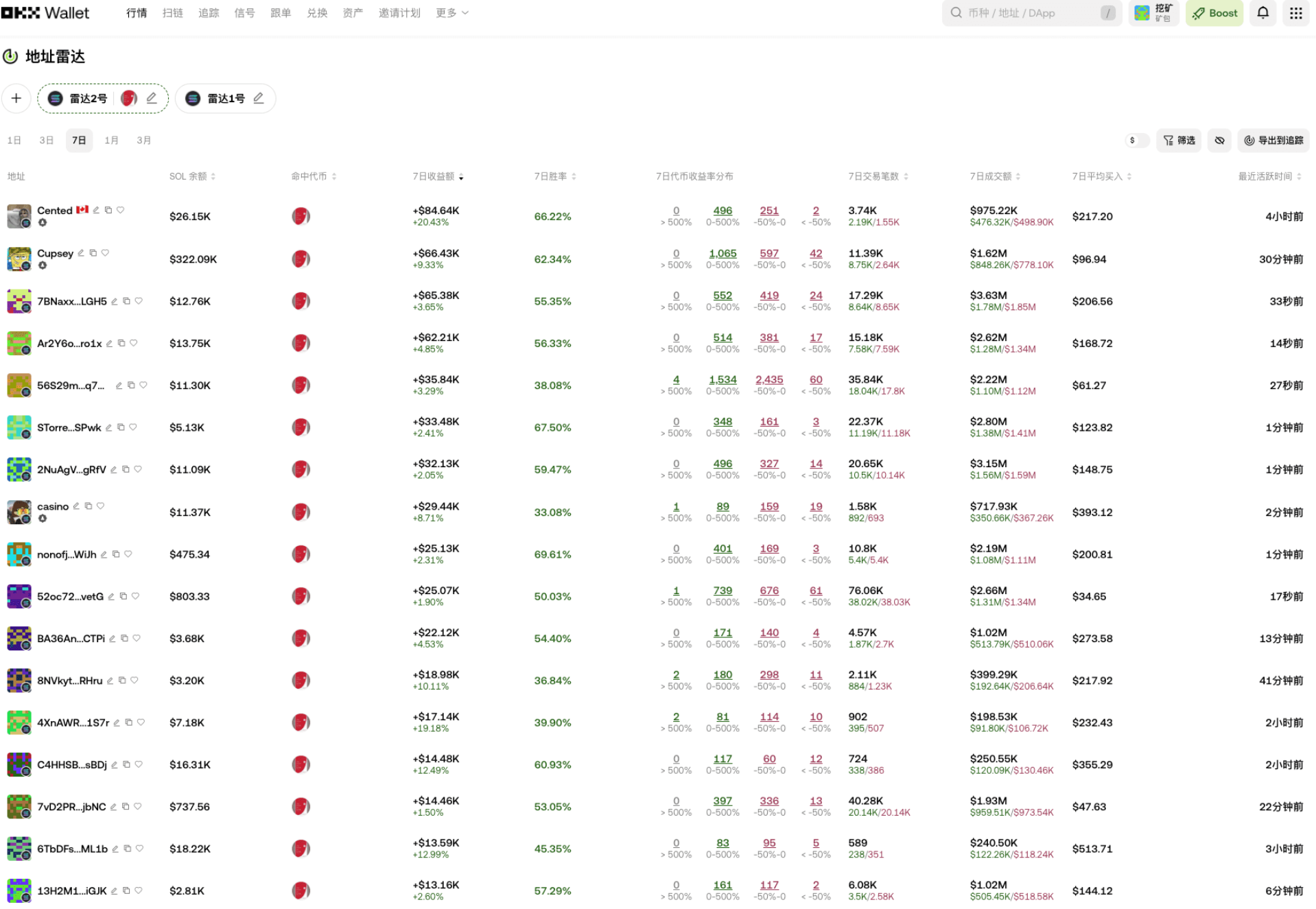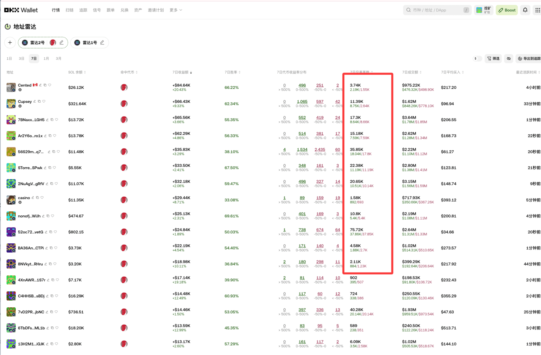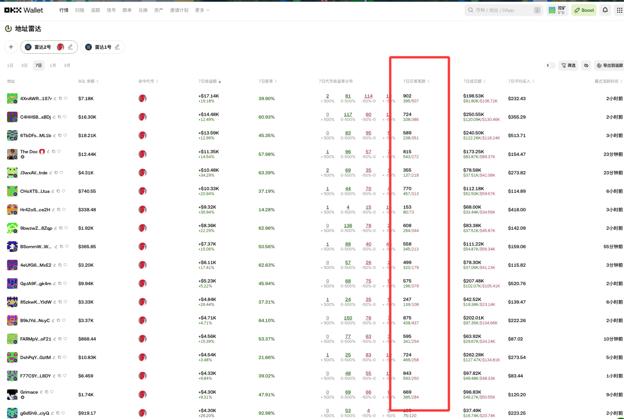 第一步先排除机器人和刷子。像那种几天内交易几千笔、甚至几万笔的地址,还有带 “K” 字标记的,全是套利机器人,交易没深度,只赚点小钱,不值得跟踪。
