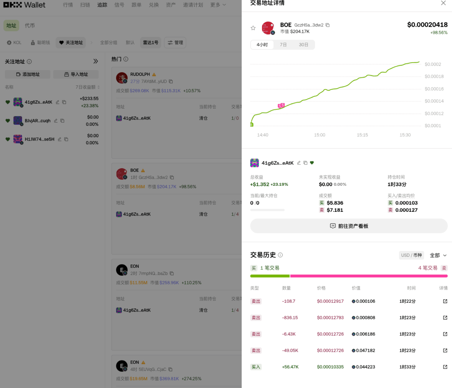 咱们别的不行,抄聪明钱的作业可是专业的!没赶上之前直播的宝子,赶紧去翻前两期回顾补补课。你看咱们精筛出来的这几个地址,最新一笔操作刚结束,又赚了 23% ,全是实打实的收益,这就是找对聪明钱的魅力!