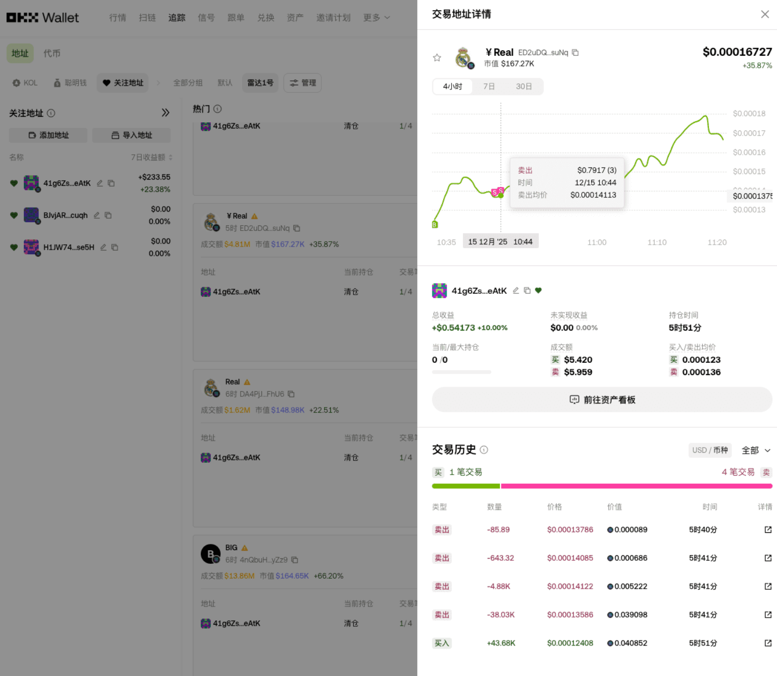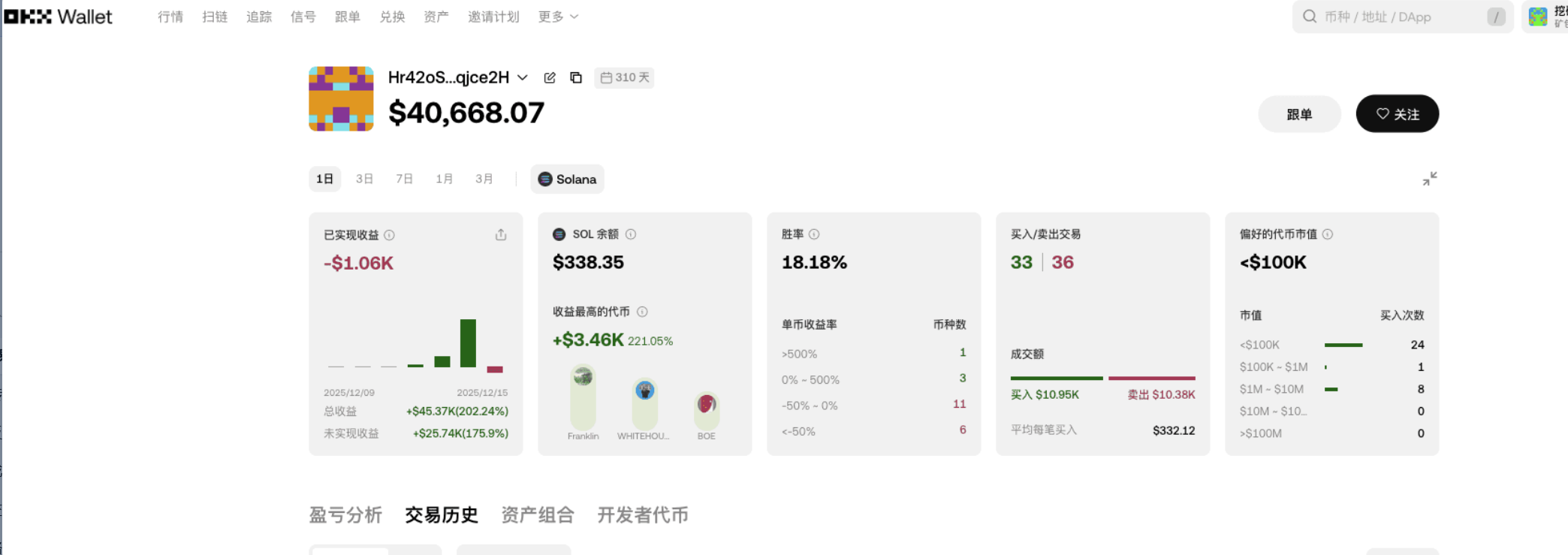 第二步锁定有余额、够活跃的地址。要是地址余额归零,说明早就弃用了,跟踪毫无意义;还要看近 1-3 天有没有交易,上次活跃时间不能太久,这样才是还在运作的真聪明钱。咱们一个个看,这 5 个地址都有余额、有近期交易,第二个虽然胜率稍低,先留着对比。