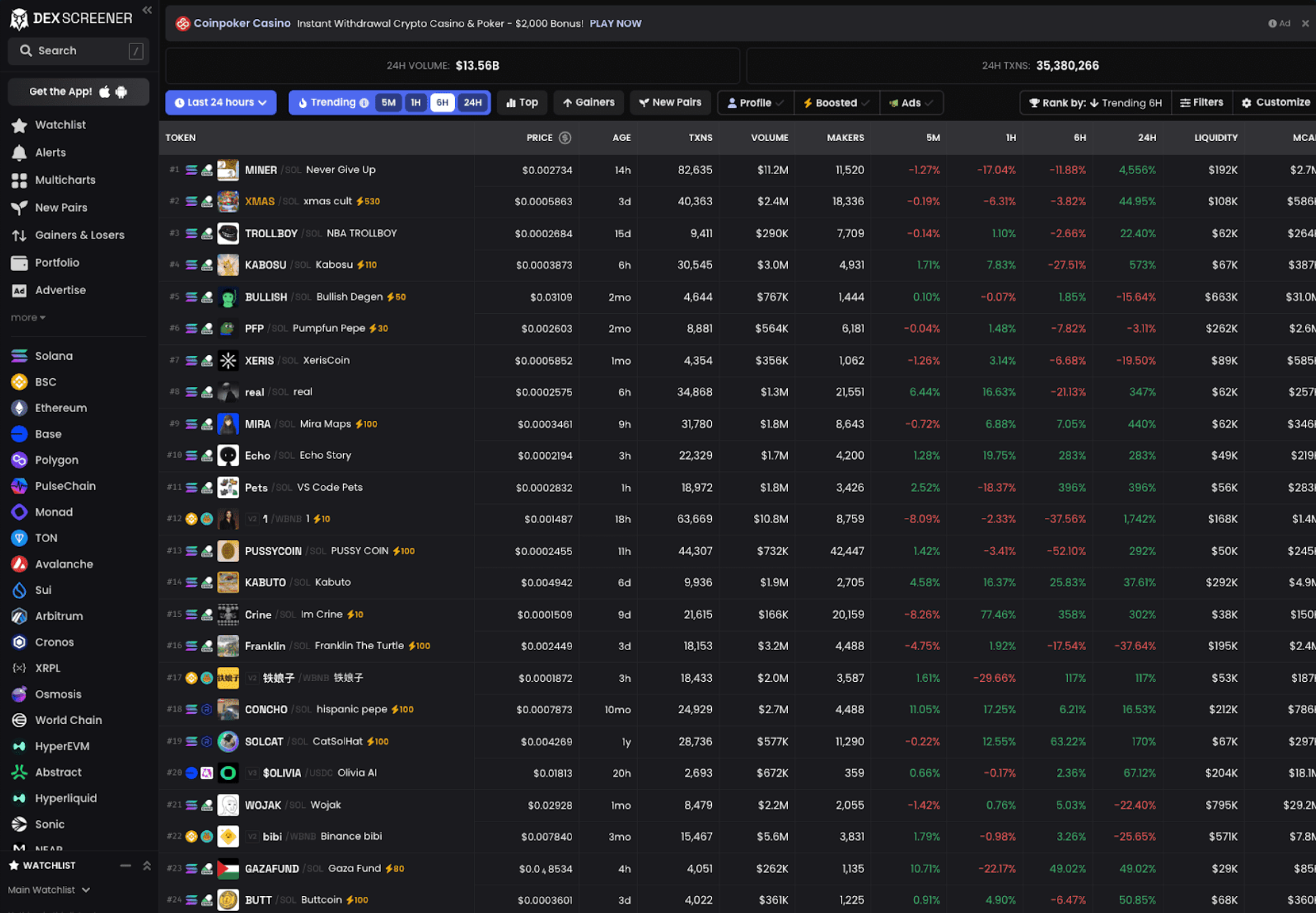比如在 DexScreener 筛选,市值选 30K - 10M 美元(太低容易跑路,太高难翻倍),流动性要大于 1 万美元(避免滑点太高),持有地址得超过 1000 个。
