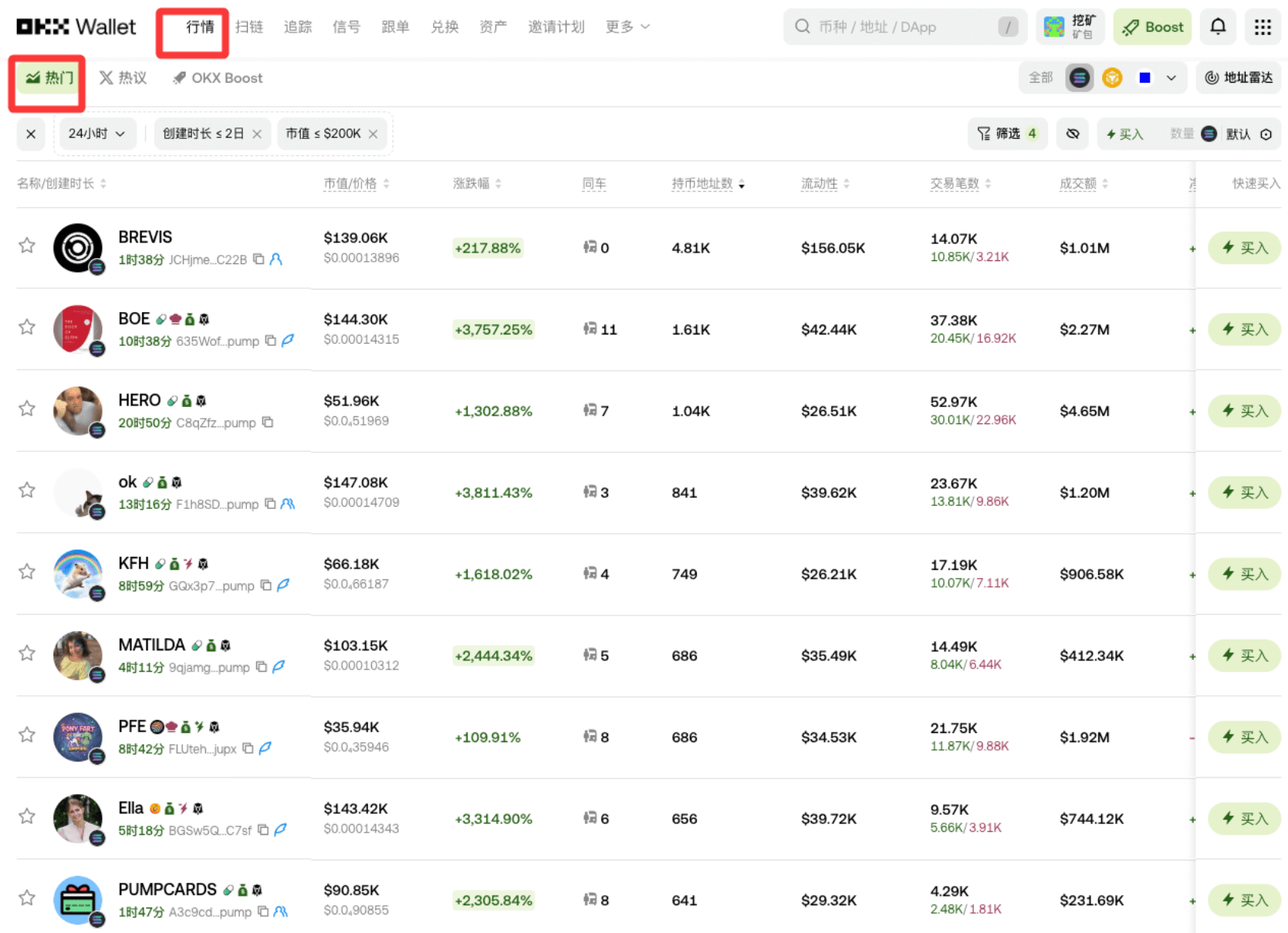 主播更推荐新手用 OKX,体验感拉满,完全贴合咱们的使用习惯!操作路径超简单:打开 OKX Wallet,在行情榜单里找热门 MEME 币