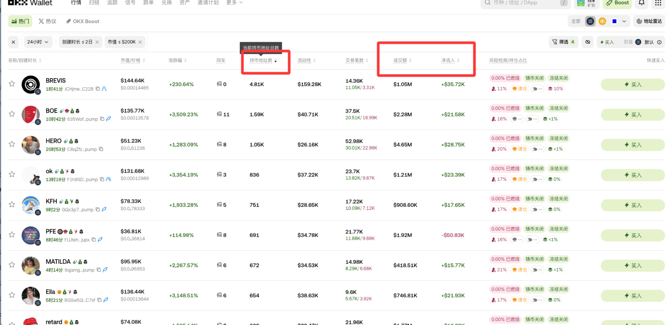 下一步按 “持币地址数” 从高到低排序,再结合净流入、成交额综合判断,挑几个优质币重点关注。