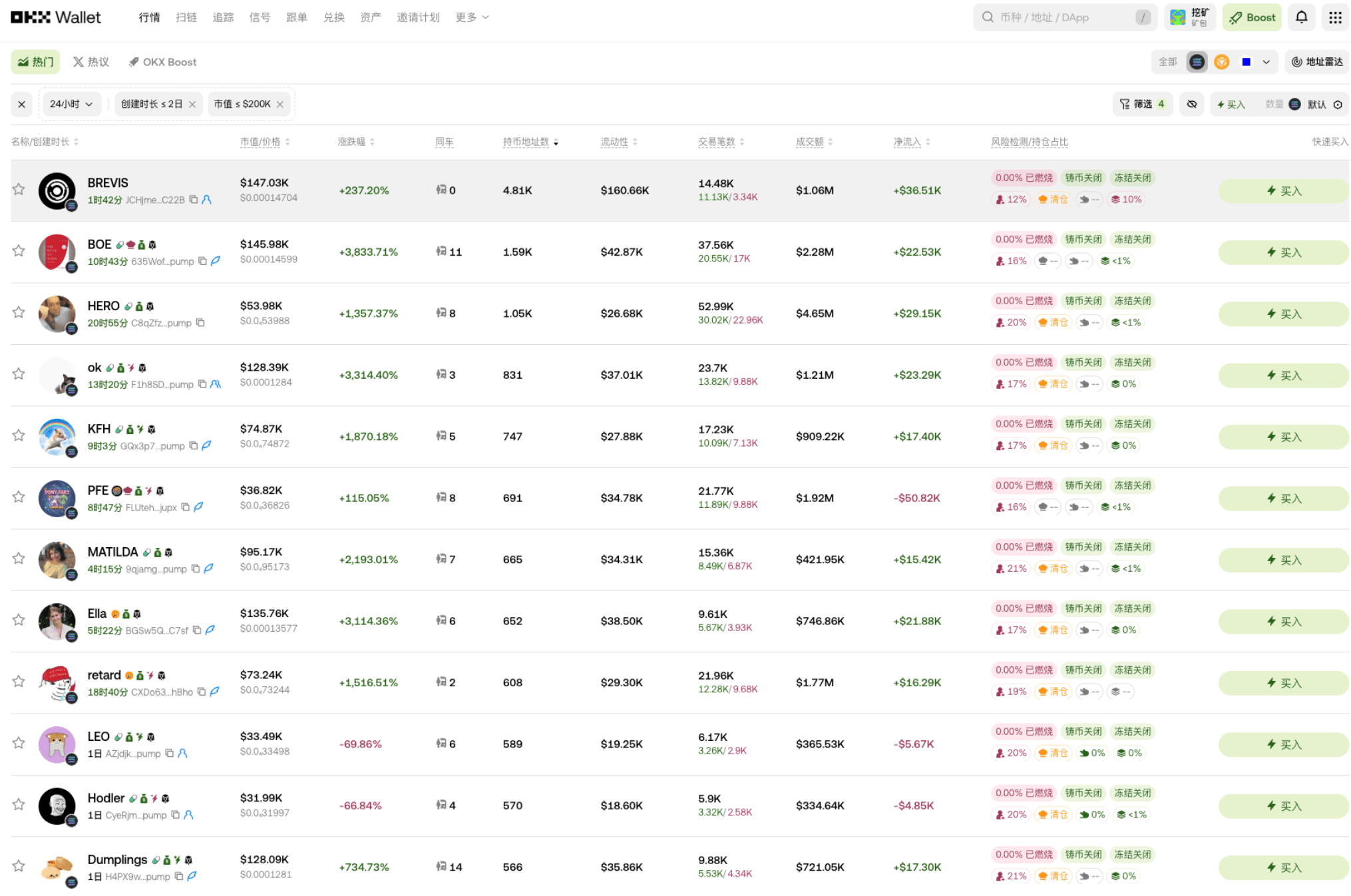 筛选条件盯紧 “金狗特征”—— 上线 1-2 天、流通市值 30K 到 10M 美元就行。我现在用的筛选条件是创建时间小于 2 天、市值≤200K,也能精准挖到潜力币。