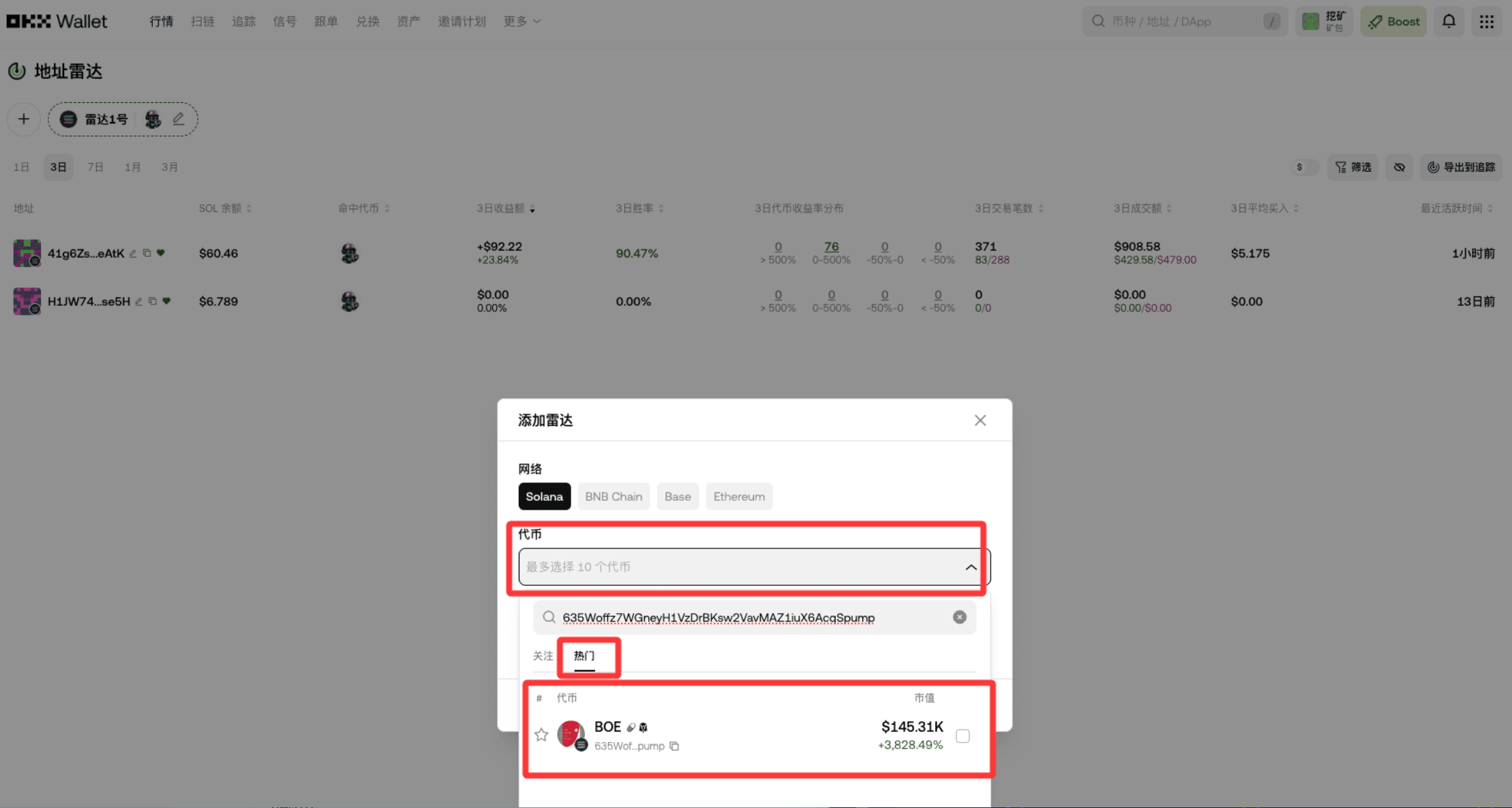 接下来是第二个核心技巧:用地址雷达找聪明钱。咱们就拿刚才筛出来的 BOE 币举例,实操给大家看!从这里进入地址雷达,找到 BOE 选中它,给它起个好记的名字,上次叫雷达 1 号,这次就叫雷达 2 号,看看能不能再挖到宝藏地址。
