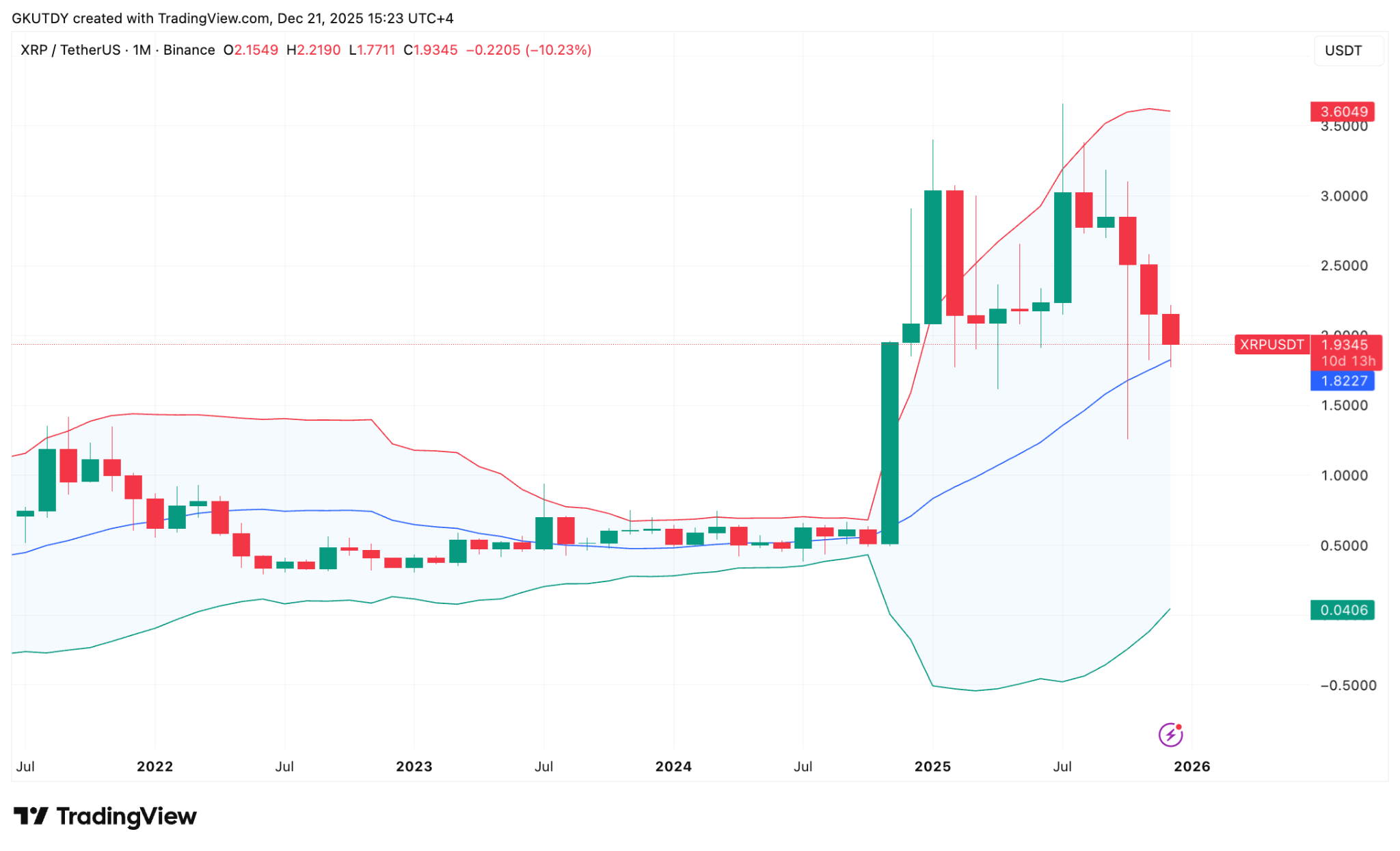 XRP在TradingView上的月度图表仍然在做多头所需的事情:在深度下探后保持中间布林带。图表快照显示本月开盘价为$2.1549,最高价为$2.2190,然后下探至$1.7711,最后在$1.9345附近收盘。这在纸面上是一个大幅回撤(-10.23%),但关键细节在于市场拒绝接受的价值位置。