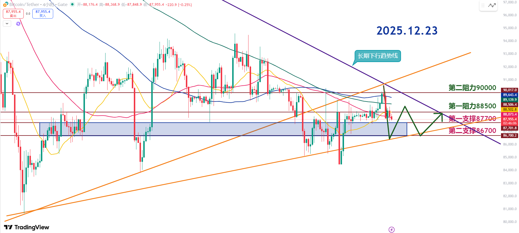 技术面上周末走的是横盘震荡+消耗多头耐心的标准剧本,86.7K–87.7K 这一段是现在最重要的支撑区,跌不跌全看这里。