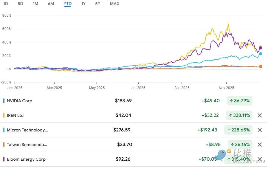Bloom Energy、IREN、美光(Micron)、台积电(TSMC)和英伟达(NVIDIA)的表现均显著优于大盘,因为资本正在追逐那些「机器必须经过」的资产。