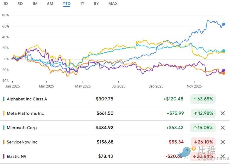 在软件和数据领域,表现则沿着另一个维度分化:(1) 强制性 与 (2) 可选性。嵌入工作流程和强制续订的类平台企业系统(如 Alphabet、Meta)继续复合增长,年内迄今双双上涨,因为 AI 支出强化了其现有的分销护城河。ServiceNow 和 Datadog 尽管产品力强,但由于估值压力、来自超大规模云服务商的捆绑压力以及 AI 货币化速度较慢,回报受到拖累。Elastic 则说明了不利情况:技术实力强,但受到云原生替代品的挤压,且单位经济回报正在恶化。