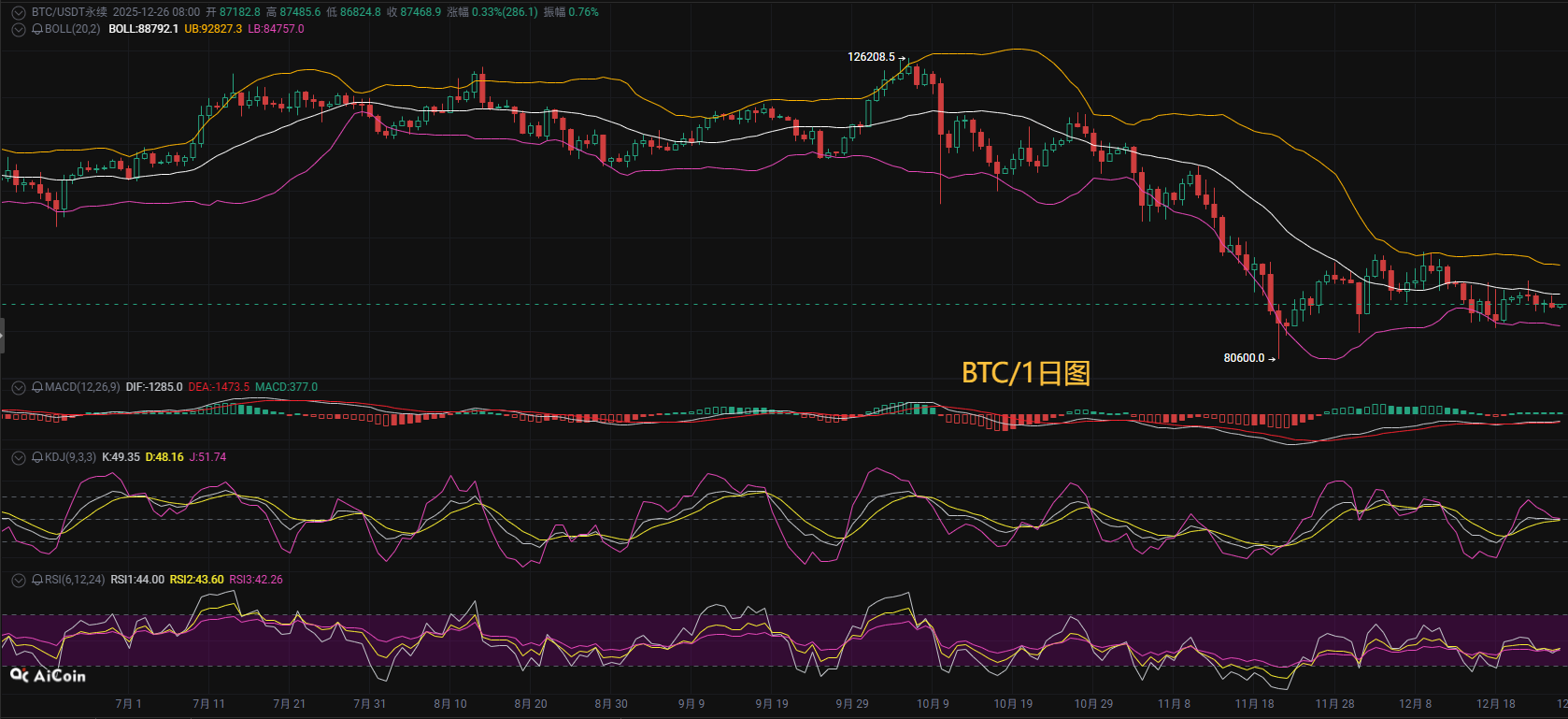 比特币日内触及上方短线压制区域回调,目前价格在87300附近一线运行,短期走势维持区间弱势震荡,后续若是不能突破企稳上方压制,预计后市价格还将回调测试下方支撑区域,望各位币友提前做好准备。注意破位行情将试探85000一线,4小时级别K线在86891.7低点处出现长下影线的锤子线,87000整数关口存在明显买盘支撑;然而日线已连续三天收于87500下方,形成短期顶部结构,前高88592成为关键阻力。