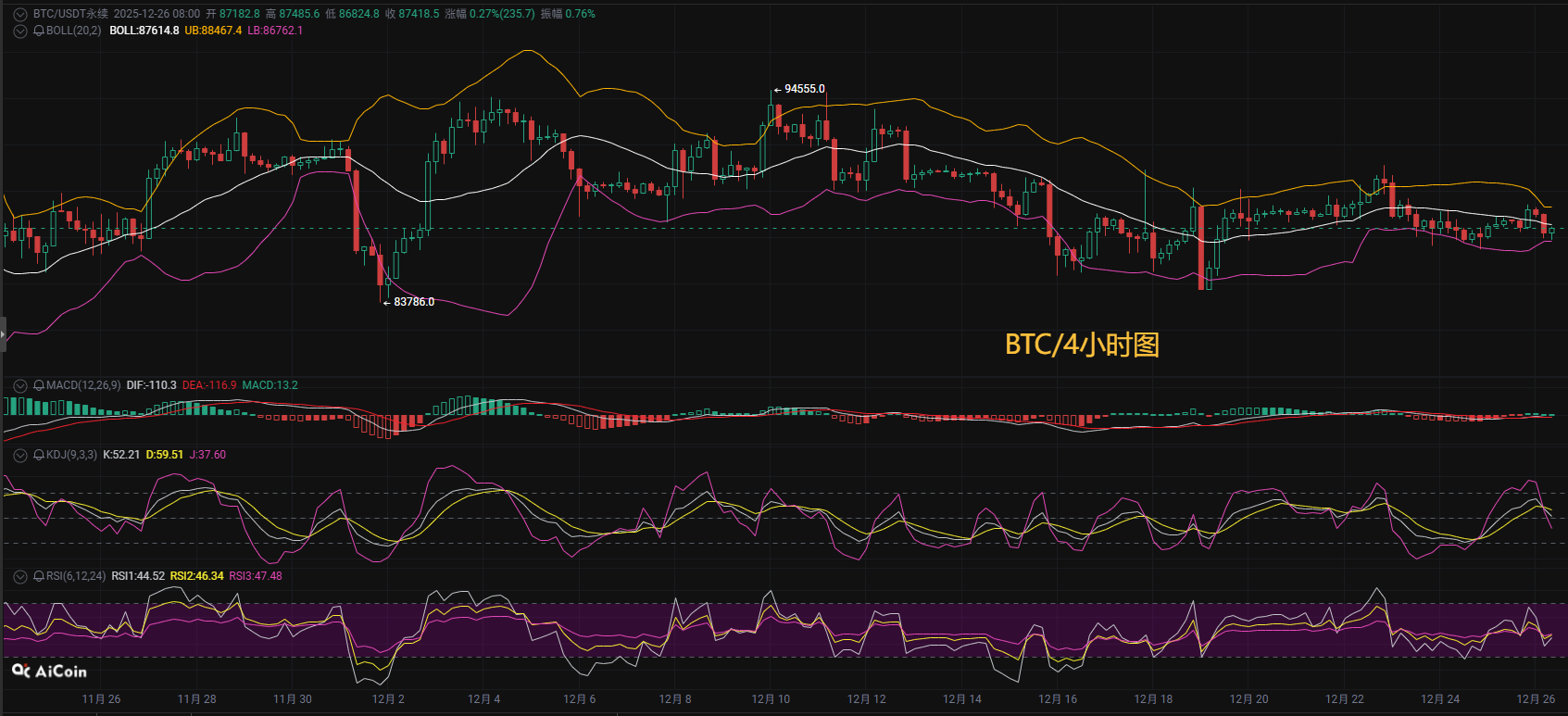 技术指标来看:4小时MACD中DIF与DEA在零轴下方金叉,柱状体翻红(约10.5柱体),但日线MACD仍处于死叉状态,价格在所有周期均受制于EMA30均线(4小时约87820,日线约89780),且7日均线与30日均线已形成空头排列。整体趋势还是偏向弱势,但目前没有破位延续区间宽幅震荡,区间高空低多即可。区间还 关注88500至86000,操作上可高空低多,反弹空为主,