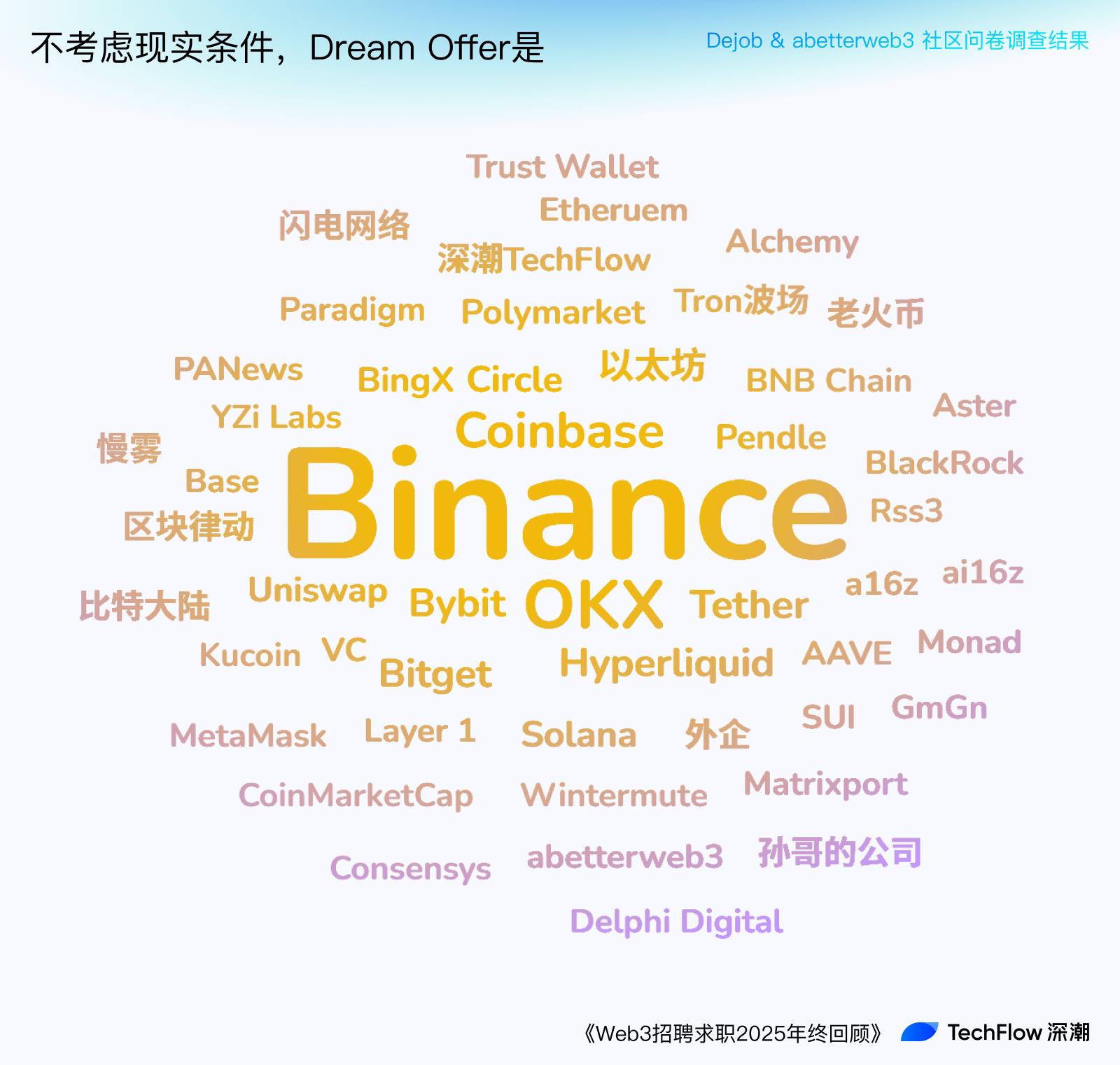 币安作为行业龙头不出意外的被评为榜首。作为“币圈腾讯”,币安既有圈外人的滤镜,也有行业内简历金字招牌的作用,在扶持个人职业生涯上名副其实。链上新贵 Hyperliquid 作为非交易所企业入围前 10,某种意义上反映了其社区的强壮和人们对非交易所产品的渴望。除头部交易所外,这个答案里外企/海外 infra 的名字显著增加,也某种意义上反映了大部分求职者对外企的滤镜和对华人团队的失望。