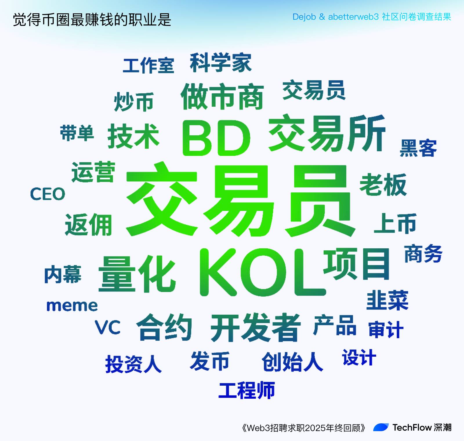 在“觉得币圈最赚钱的职业”一问中,高频关键词有: